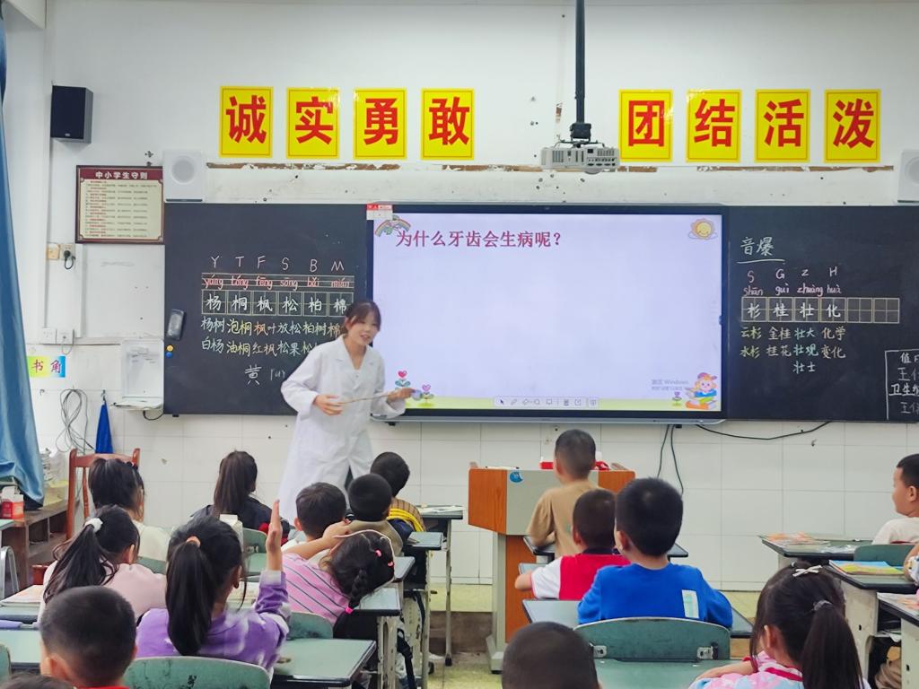 挂牌仪式举行以后,口腔医学22-1团支部12名志愿者进入二年级6个班开展科普公益课,参与员工322人。通过通俗易懂的语言和生动形象的动画短片,让小朋友们懂得爱牙护齿的重要性。课中小朋友们积极举手回答问题,当起了同桌的“爱牙小卫士”,并纷纷表示以后不仅要做自己的“爱牙小卫士”,也要做全家人的“爱牙小卫士”。
